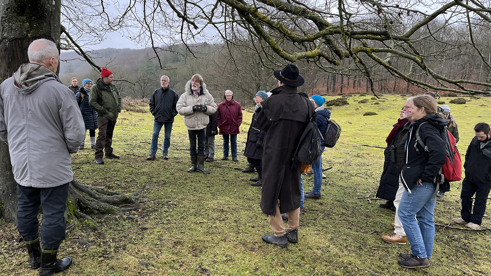 Her ses billeder af en stor forsamling af lokale beboere, der startede året ud med en spadseretur i bakkerne som erstatning for den corona-aflyste nytårskur. Bærsnapsen fra den forgangne sensommer var startskuddet til vandringen på en ca 2-3 kilometer, hvor Henning og Bent var guider for en interessant tur over og for foden af Ravnsbjerg. Turens tema var præget af beretninger og fortællinger af både historisk art fra krigens tid, samt af både historisk og nutidig beretning om naturens tilstand i området. Særligt interessant var spændingerne imellem de forskelligartede interesser i området, hvor Bent skildrede visionerne om naturnationalparken og områdets status som både fredet og Natura 2000 beskyttet samt forholdet mellem private og statslige og kommunale interesser. Der er mange forhold som gør sig gældende i de respektive kategorier og naturklassificeringer, som ikke altid harmonerer. Ligeledes spændende var det at høre om lokale odderfamilier og andre særlige dyrearter i området. Og så gemmer området åbenbart på helt unikke og særlige mosarter, som jo er en mytisk og hemmelig verden for sig.