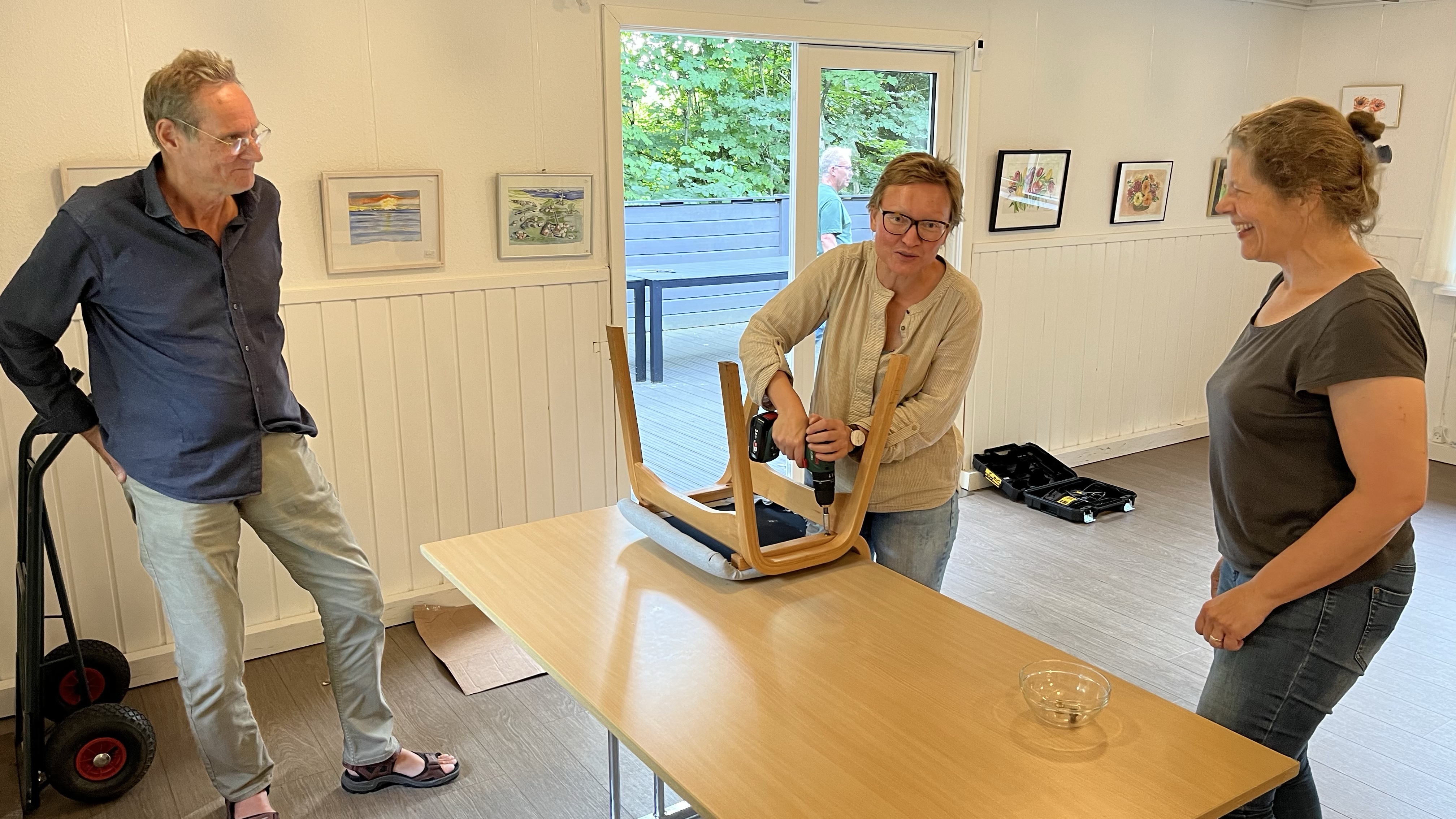Holdet var så effektive, at alle stole i forsamlingshuset stod klar allerede efter lige under 3 timer. Og med alle fingre intakt blev der efter bedriften indtaget pizza og fortalt anekdoter fra livet i Dollerup.