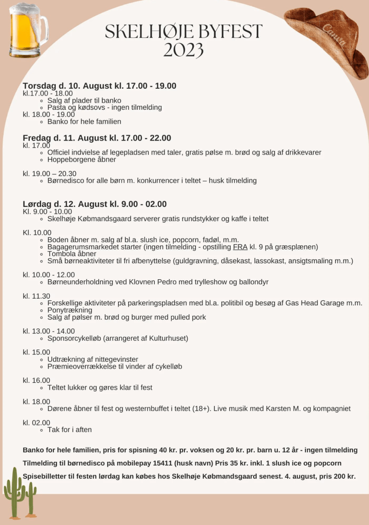 Det er sæson for sommerfester, og vores naboer i Skelhøje holder byfest d. 10., 11. og 12. august. Vi er inviteret og herunder samt på vores facebookside kan I finde programmet.