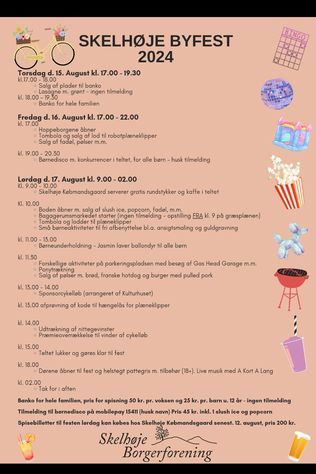 Jeg bringer hermed en festlig nyhed: Skelhøje holder byfest og vi er velkomne til at bidrage til festlighederne 🥳 Det løber af stablen d. 15. august til d. 17. august, så kig forbi Skelhøje i de dage. Du kan se programmet herunder, eller slå byfesten op på Facebook “Byfest i Skelhøje 2024”.
