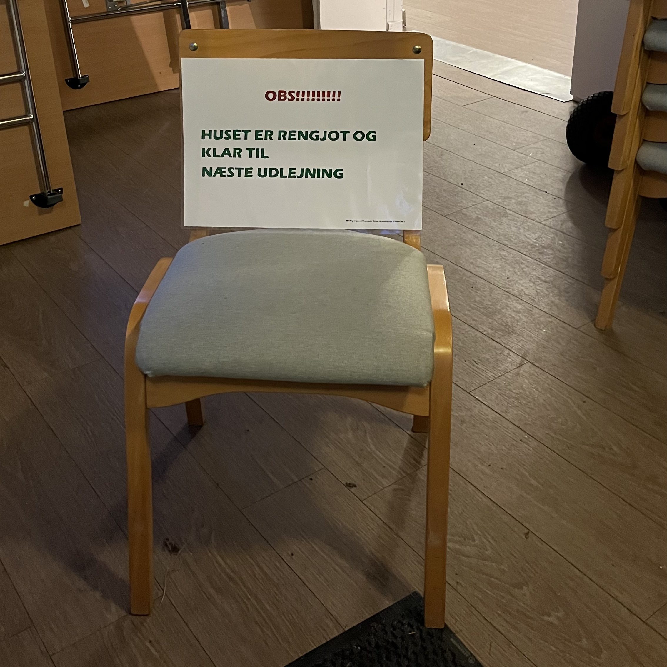 Så for alle brugere, der benytter huset, lejere som arrangører, så vær meget opmærksom på, hvilke “spor” du efterlader. Særligt når huset er gjort klar til udlejning. Ser du ovenstående skilt, eller ser du at der er sat et bånd op lige inden for yderdøren, så betyder det, at Trine har gjort sig umage med at gøre rent og vaske og ordne skraldespande mv. forud for snarlig udlejning. Derfor skal DU sørge for at: